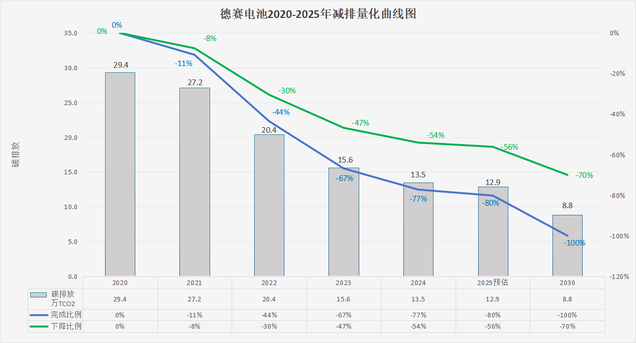 2020年德賽電池(仲愷工業(yè)園)的范圍1、2、3碳排放總量約為29.4萬(wàn)噸,德賽電池通過(guò)不懈努力,僅至2024年,公司已成功將碳排放總量削減至約13.5萬(wàn)噸(已完成77%的目標(biāo)),實(shí)現(xiàn)相對(duì)于基準(zhǔn)年碳排放總量54%的顯著減排,2025年預(yù)計(jì)碳排總量約為12.9萬(wàn)噸(預(yù)計(jì)完成80%的目標(biāo)),實(shí)現(xiàn)相對(duì)于基準(zhǔn)年碳排放總量56%的顯著減排。